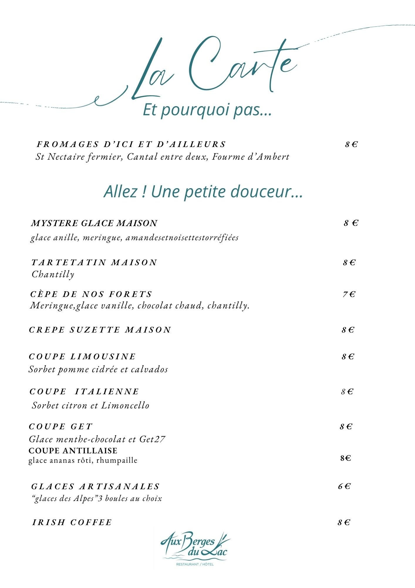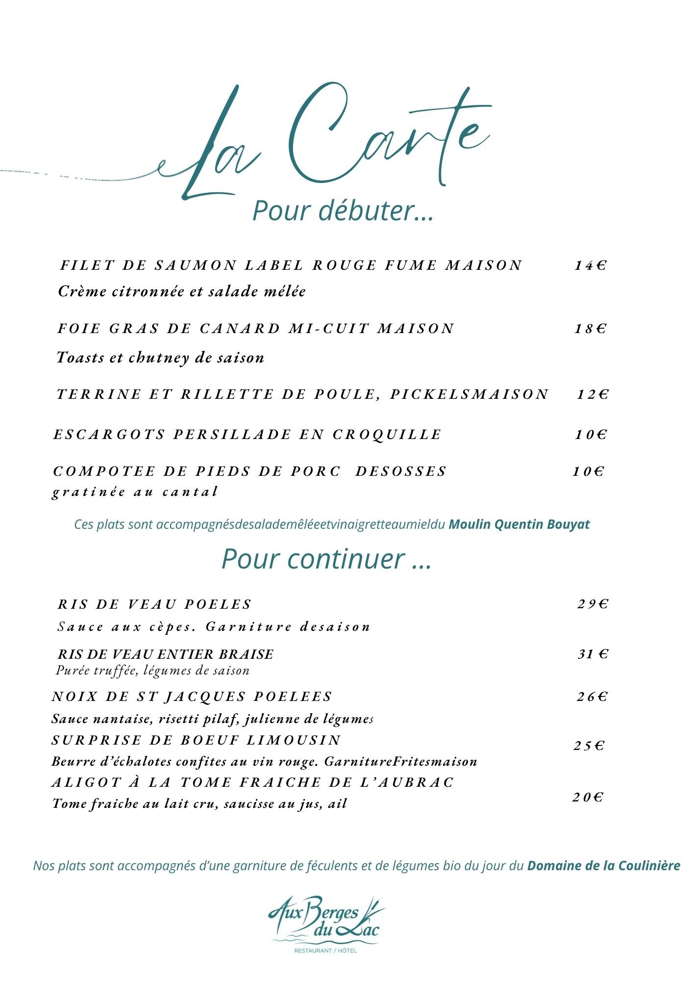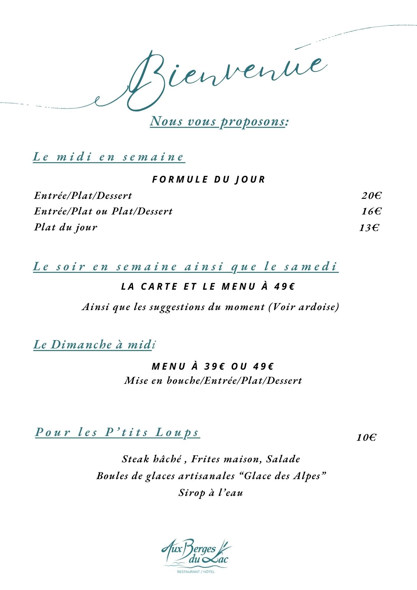 Explorez notre menu, conçu pour éveiller vos sens et ravir vos papilles. Chaque plat reflète notre engagement envers la qualité et la fraîcheur, en mettant en avant des ingrédients locaux et de saison. Que vous choisissiez une entrée appétissante, un plat principal savoureux ou un dessert irrésistible, chaque bouchée vous plongera dans une expérience culinaire unique. Laissez-vous séduire par nos créations et partagez un moment convivial autour de notre table.