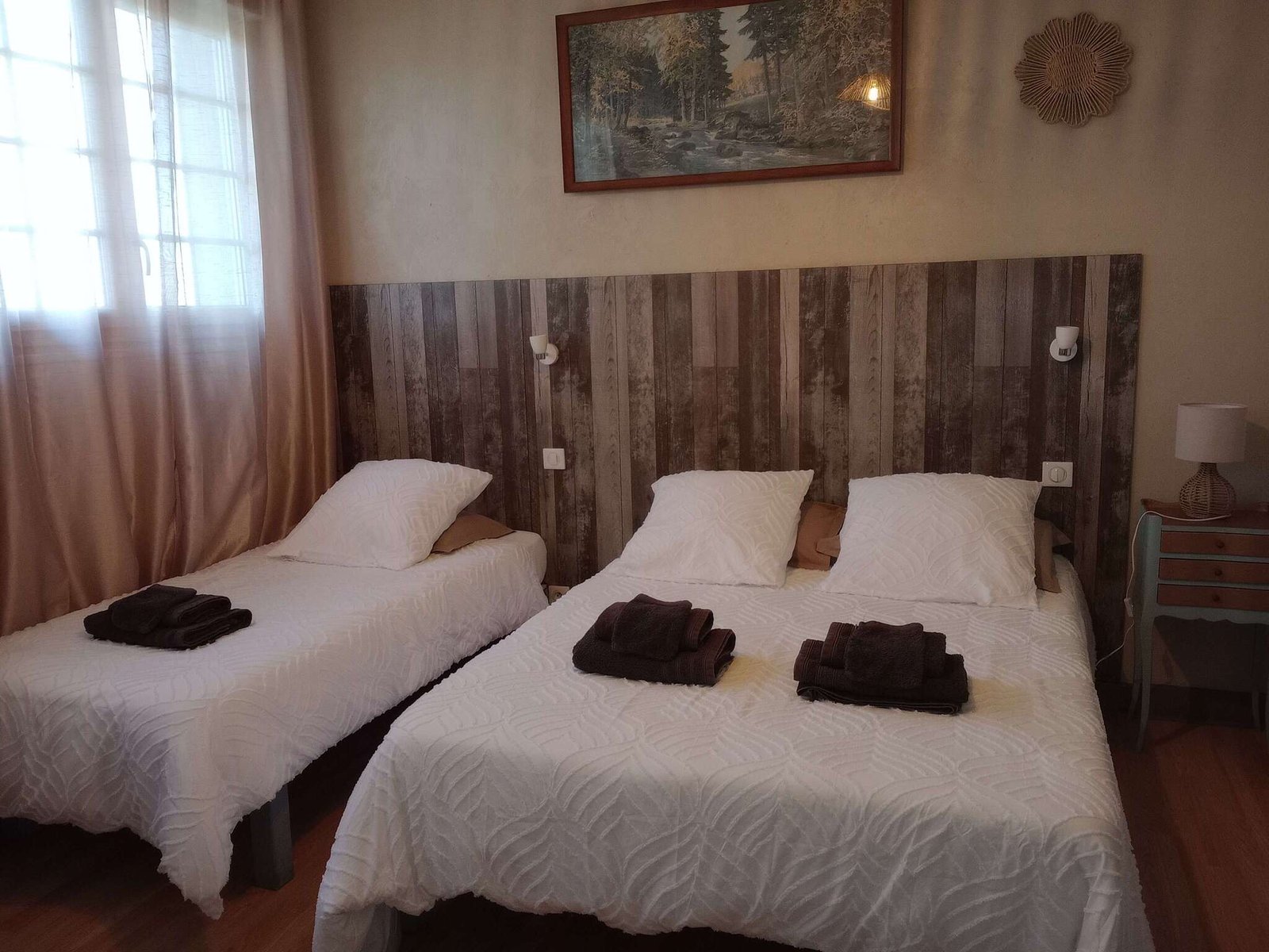 Savourez des nuits paisibles dans un écrin de nature, où chaque chambre a été conçue pour vous offrir détente et bien-être. Notre chambre avec un grand lit et un petit lit, parfaite pour un séjour en duo ou en famille, avec tout le confort moderne : télévision, salle de bain privative et WC, dans un cadre propice à la relaxation.